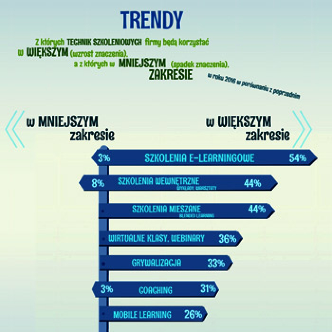 Ankietowani odpowiadali na pytania o trendy w wykorzystaniu technik rozwojowych oraz tematów szkoleń. Najpierw wskazywali oni, które techniki szkoleniowe będą częściej wykorzystywane w ich przedsiębiorstwach w 2016 roku w stosunku do roku poprzedniego, a które rzadziej oraz z których nie korzystają wcale. Drugie pytanie było skonstruowane podobnie, ale dotyczyło tematów szkoleniowych.